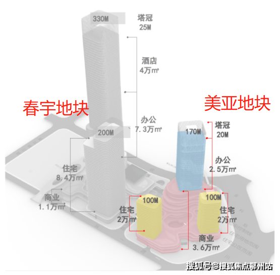 春宇地块由1栋330米办公及酒店塔楼、1栋200米住宅塔楼和商业裙房组成,总占地面积约为3.2万㎡,总建筑面积约35.4万㎡。